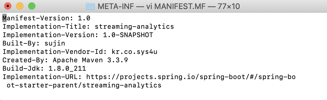 그리고 jar파일에 있는 MANIFEST.MF를 확인해보면, 다음과 같이 추가적인 정보들이 등록된 것을 확인할 수 있습니다.