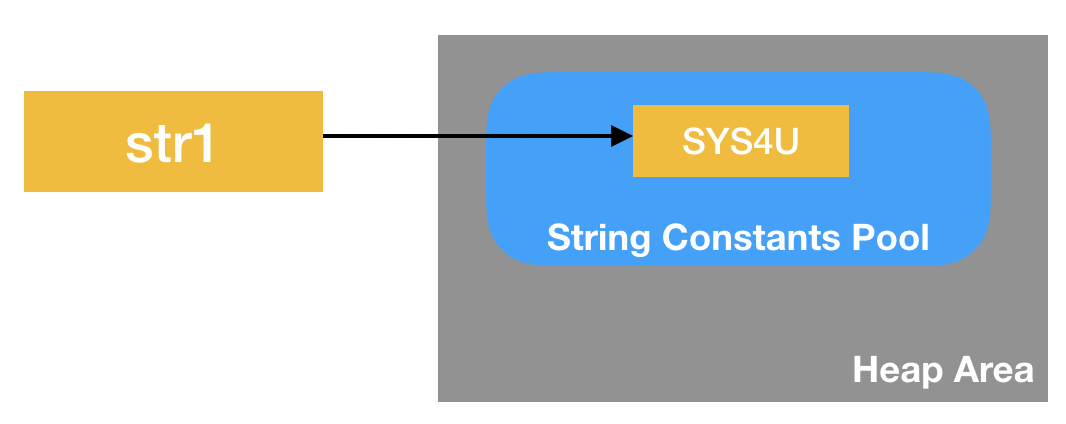 위 코드의 1라인이 실행되면 str1이라는 Reference type 변수가 만들어지고, 실제 값 "SYS4U"는 Pool에 저장됩니다.