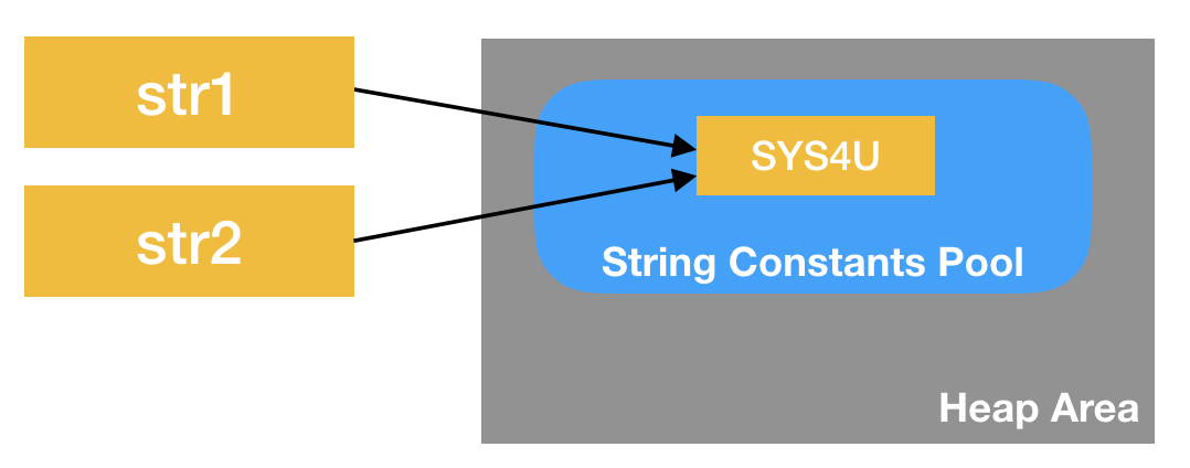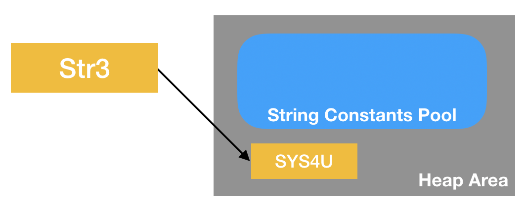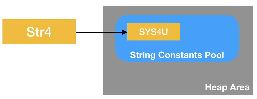 2라인에서는 저장할 값인 "SYS4U"가 이미 Pool에 있으므로 Reference type 변수 str2가 기존의 "SYS4U"를 참조하여, Pool에 있는 값을 재사용합니다.