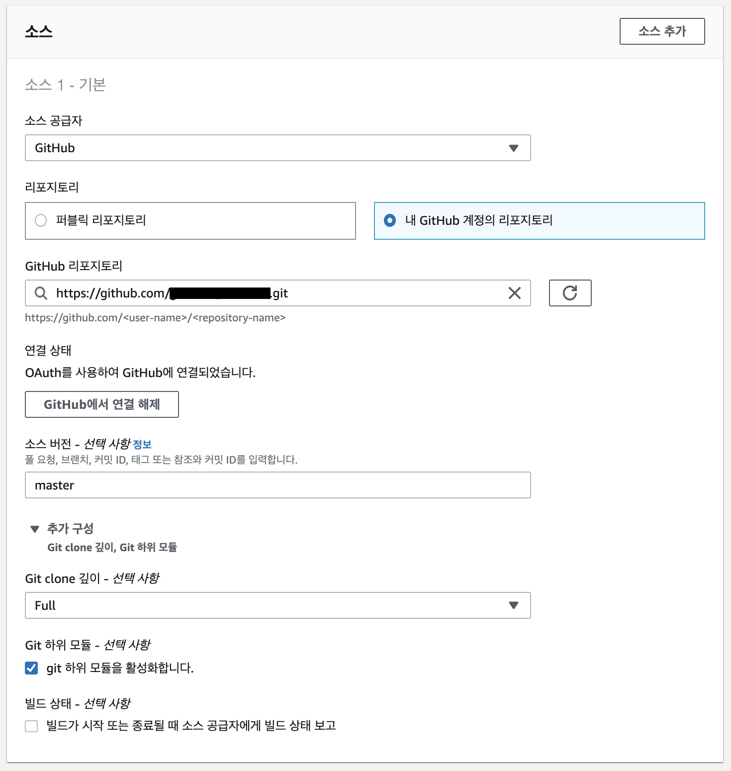 소스는 Github에서 관리하고 있으므로 소스 공급자에서 GitHub을 선택한다.
